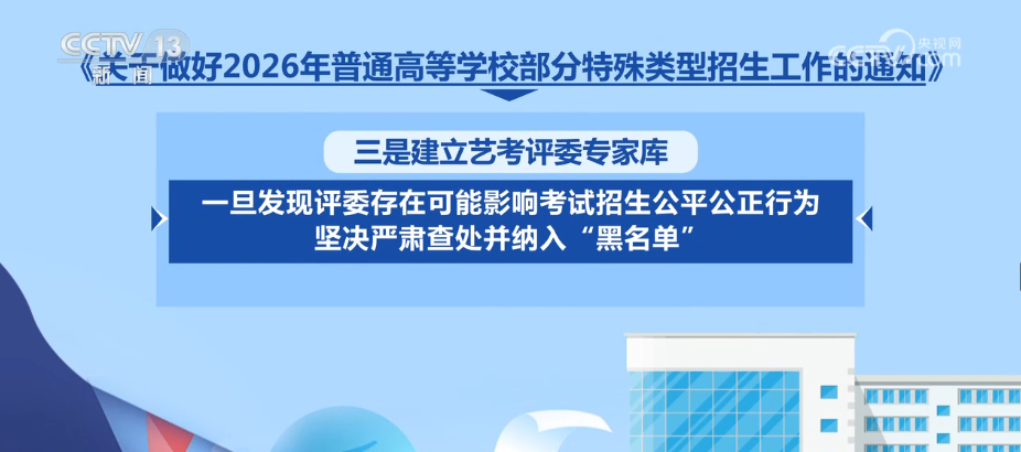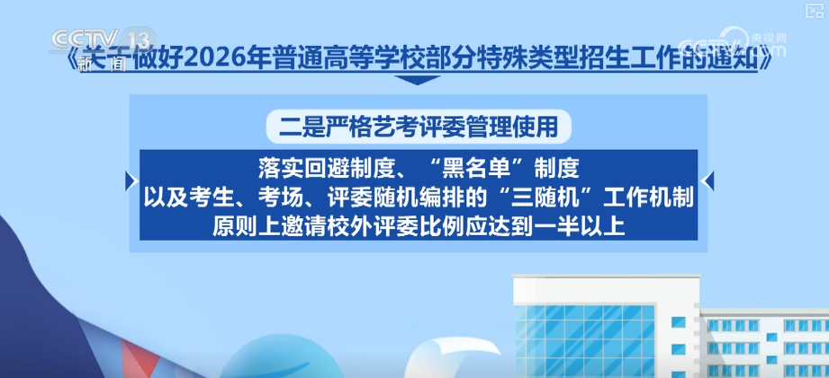 《通知》明確,一要設(shè)定考前輔導(dǎo)“禁區(qū)”,開展特殊類型招生的相關(guān)高校及其內(nèi)設(shè)學(xué)院、教職工不得組織、參與或自行開展相關(guān)考前輔導(dǎo)、應(yīng)試培訓(xùn)。二是嚴格藝考評委管理使用,落實回避制度、“黑名單”制度,以及考生、考場、評委隨機編排的“三隨機”工作機制,原則上邀請校外評委比例應(yīng)達到一半以上。三是建立藝考評委專家?guī)?,一旦發(fā)現(xiàn)評委存在可能影響考試招生公平公正行為,堅決嚴肅查處并納入“黑名單”。