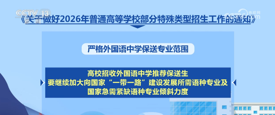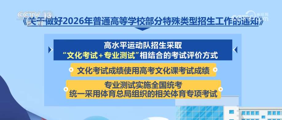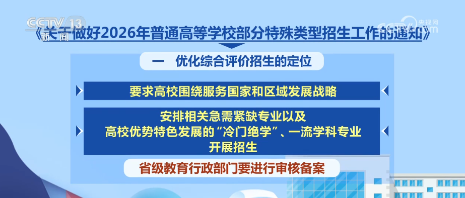 央視網(wǎng)消息:日前,教育部印發(fā)《通知》,部署做好2026年普通高校部分特殊類型招生工作。普通高校特殊類型招生主要包括藝術(shù)類專業(yè)招生、高水平運動隊招生、保送生、綜合評價招生4類。